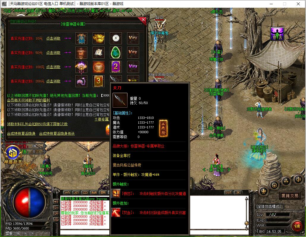 捐献使者:50%杀怪真实爆率、刀刀麻痹、刀刀切割Lv200以下的怪物1%最大血量、专属打宝地图(刷新全服顶级BOSS)