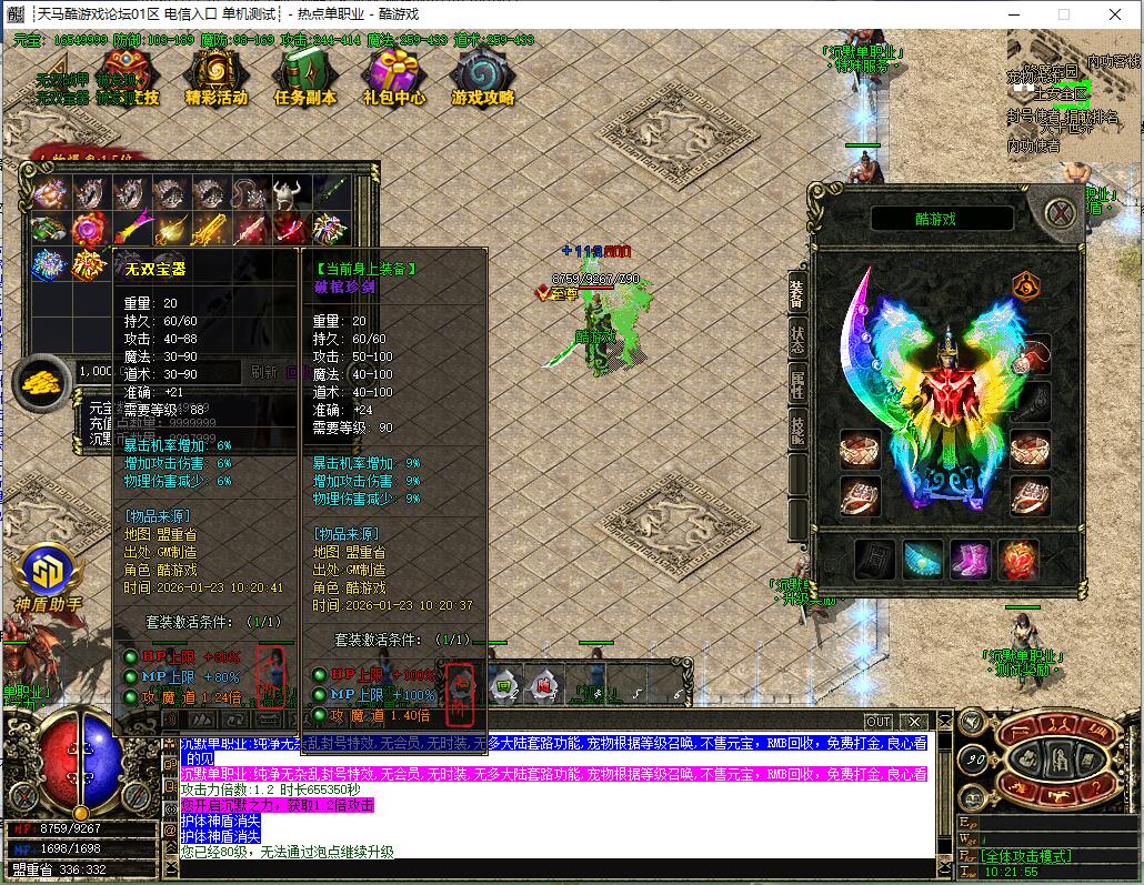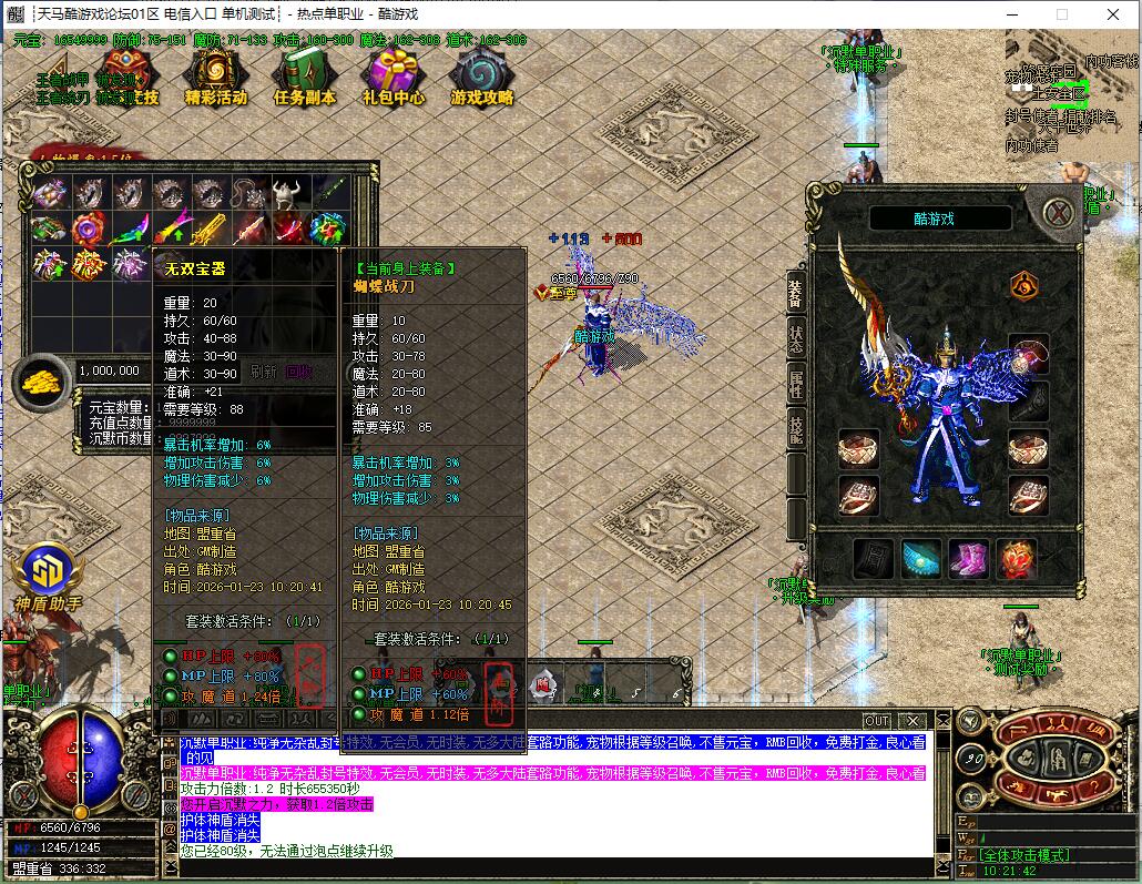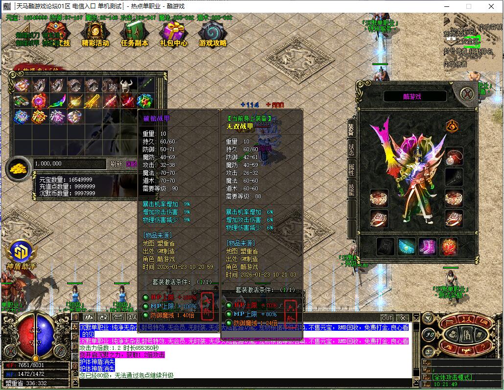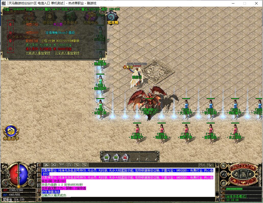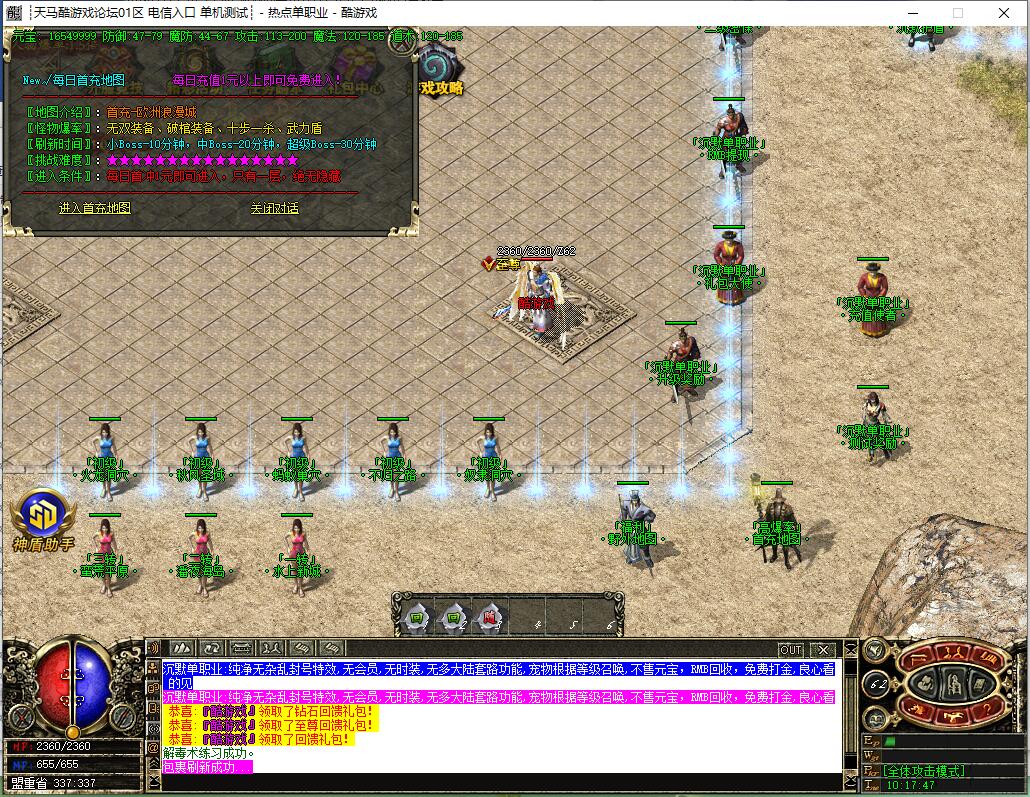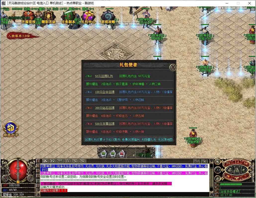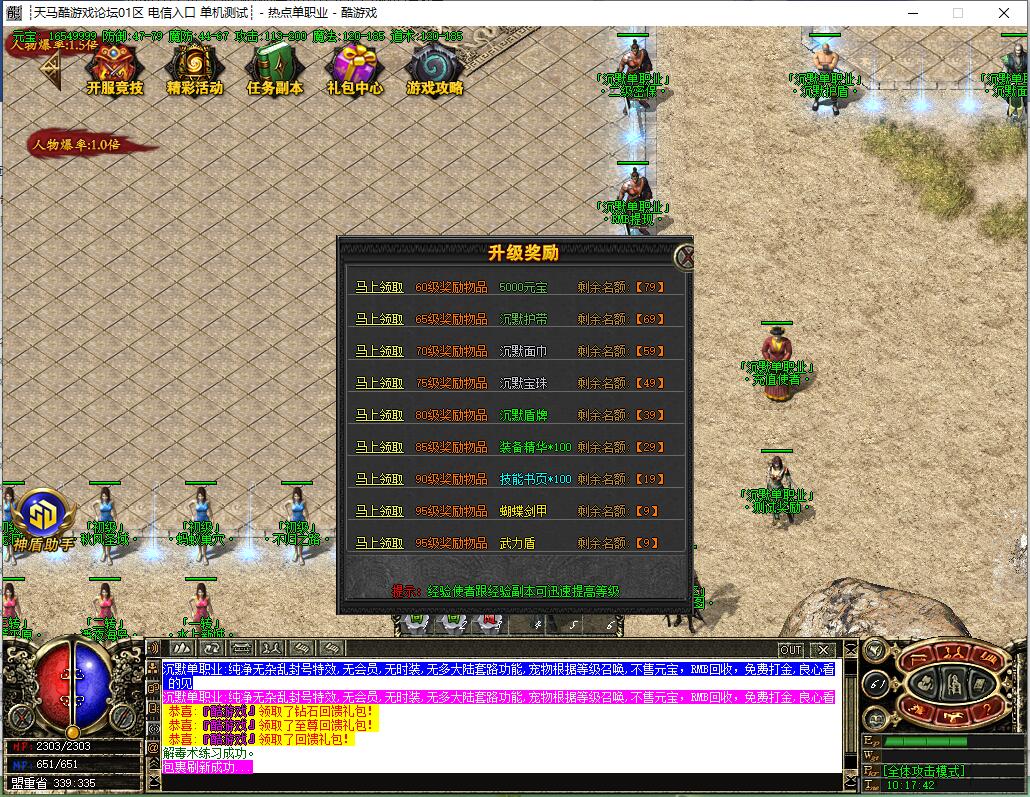 【宝物系统】:每个宝物都有不同的属性,装备精华、经验宝箱等都是本服最珍贵物品,友情提示:均衡发展!