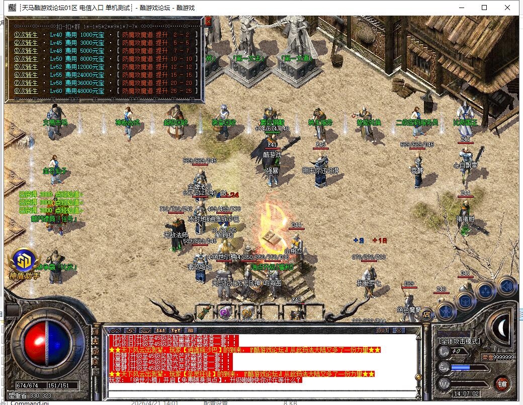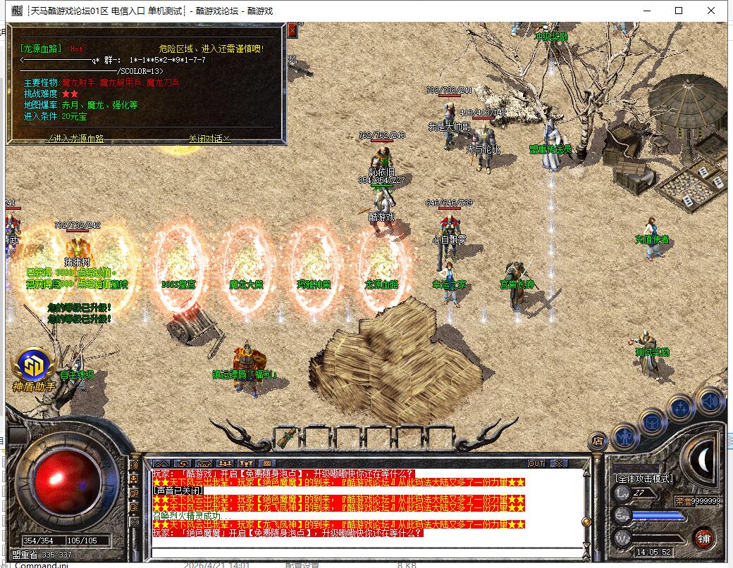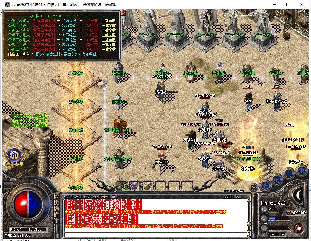 【系统】:魔龙大殿每秒扣除1元宝增加1000经验值,自主练级需手动刷怪,镖车每天五次,龙门镖局活动每天5次,回收系统经验都不容小觑。