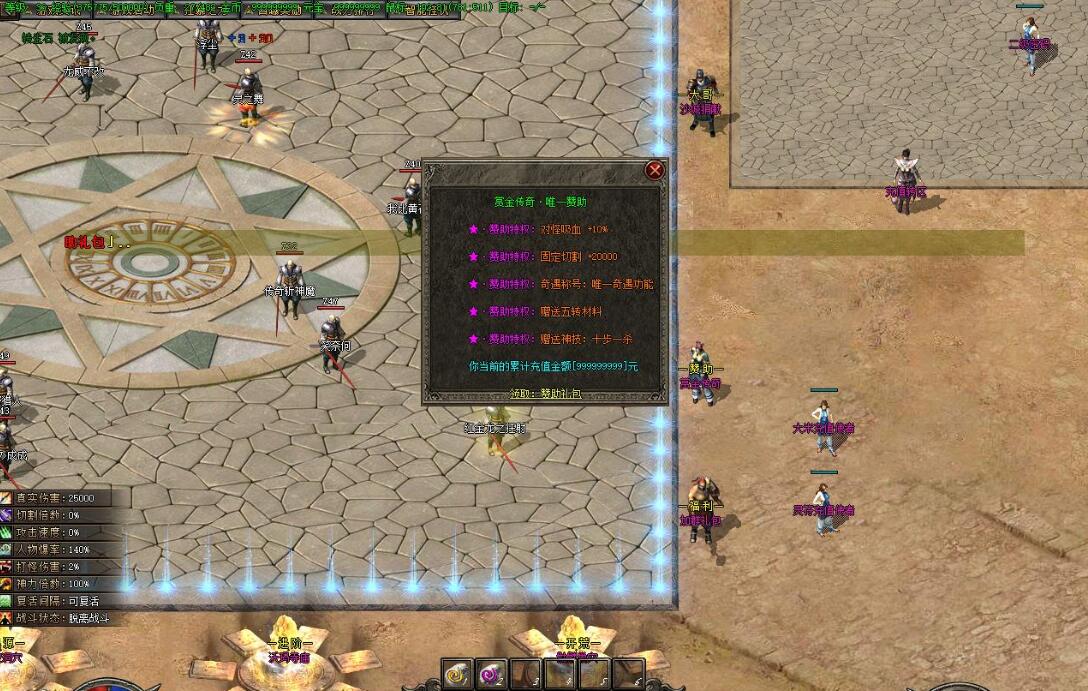 (封榜捐献) 封榜捐献需要700大米 赠送切割40000 攻速30% 爆率200% 对怪伤害60% 切割倍数20% 元宝回收+50% 自动挂机 |