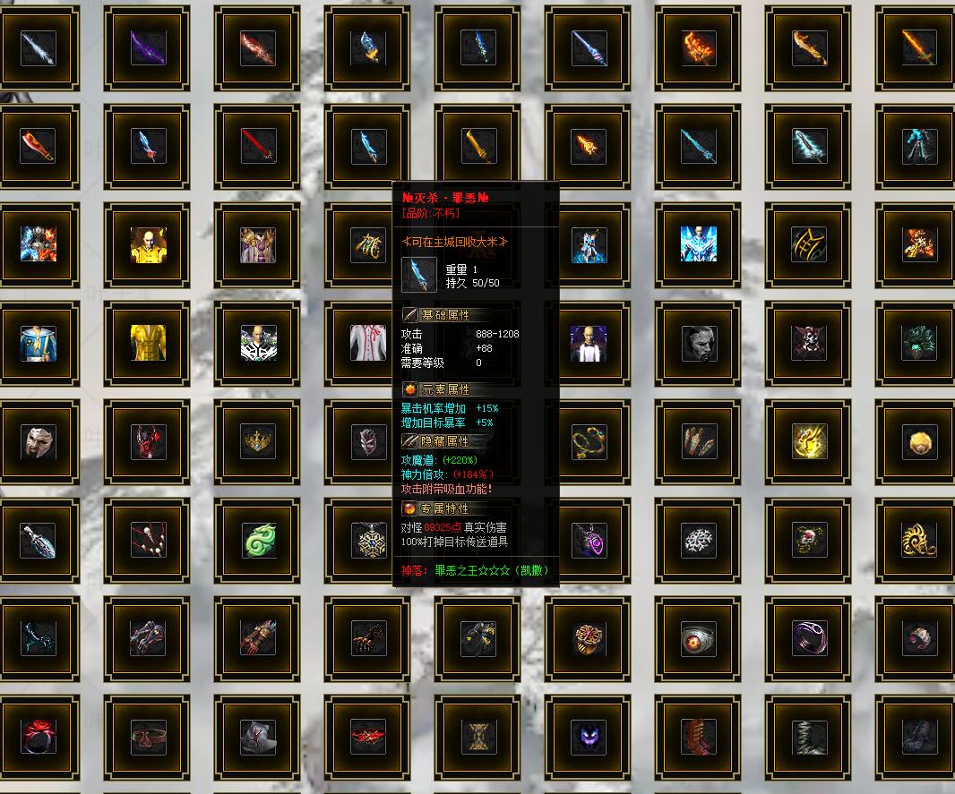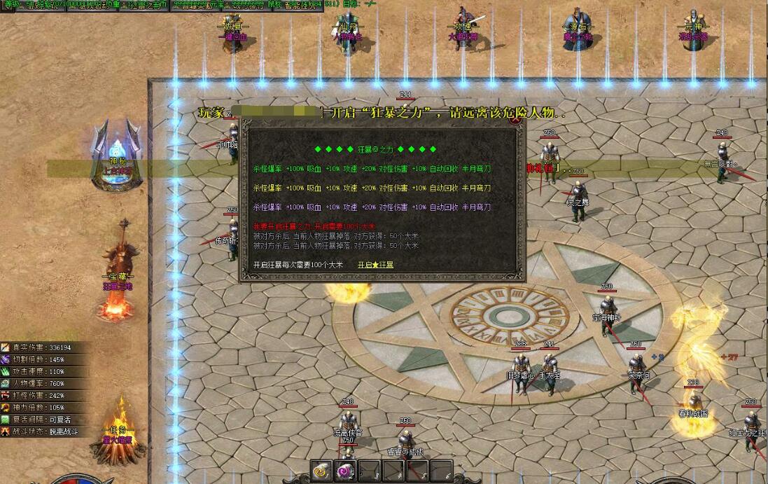 (狂暴使者) 开启需要100大米 赠送 半月弯刀 攻速20% 爆率100% 吸血10% 对怪伤害10% |