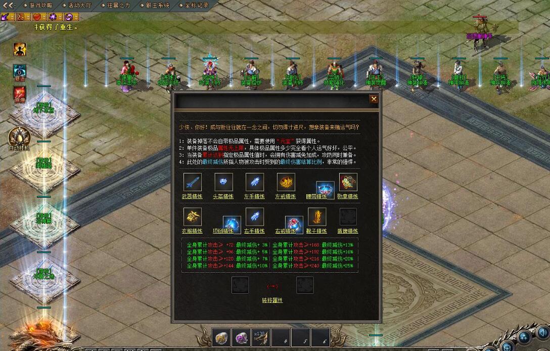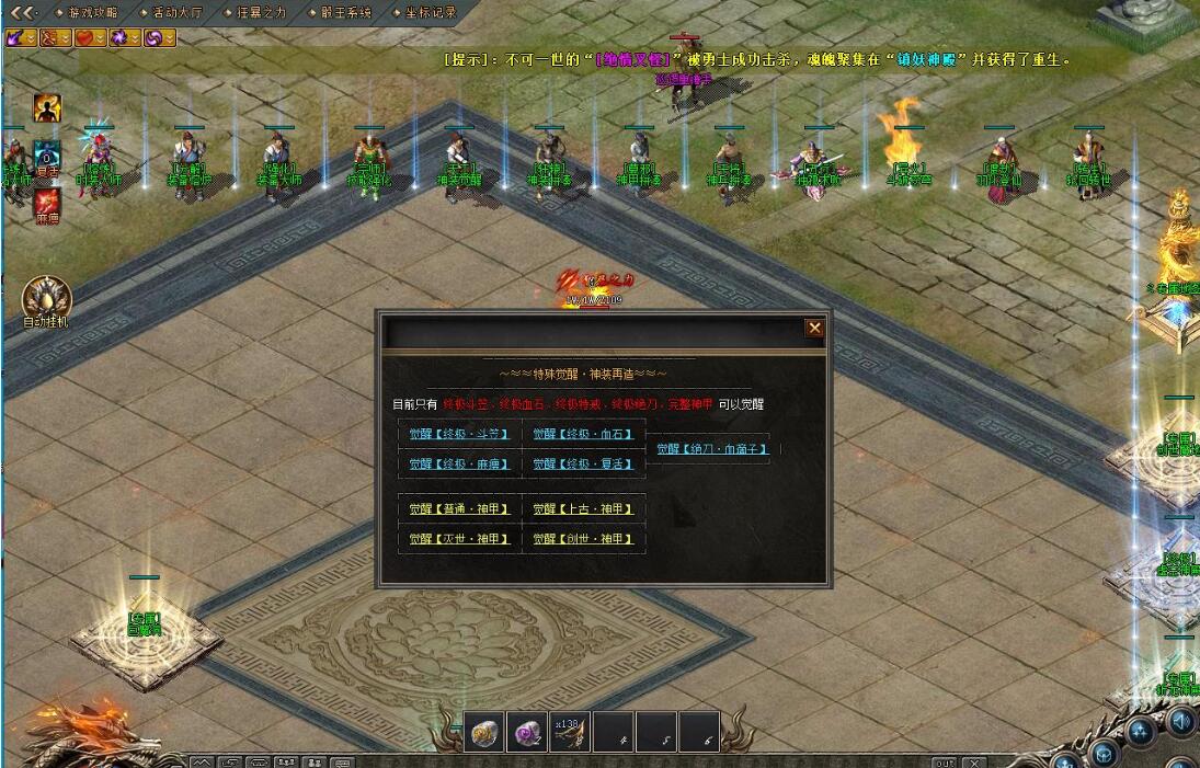 11.《技能地图|地图条件:指定对应技能强化^地图消耗:请在NPC传送处自行了解^地图特点:爆率乐观、并且拥有专属怪^地图刷新:整套地图内最高刷新1288wBoss、怪物越强刷新越慢、第二三张地图Boss死亡不会复活在镇妖神殿^地图掉落:小怪和Boss都会掉落所有装备