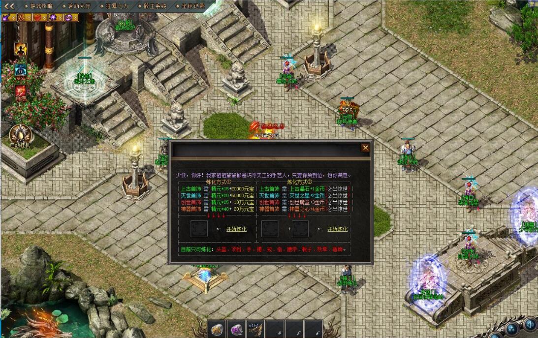 12.《五行地图|地图条件:指定对应五行等级^地图消耗:请在NPC传送处自行了解^地图特点:爆率乐观、并且拥有专属怪^地图刷新:整套地图内最高刷新1288wBoss、怪物越强刷新越慢、第二三张地图Boss死亡不会复活在镇妖神殿^地图掉落:小怪和Boss都会掉落所有装备