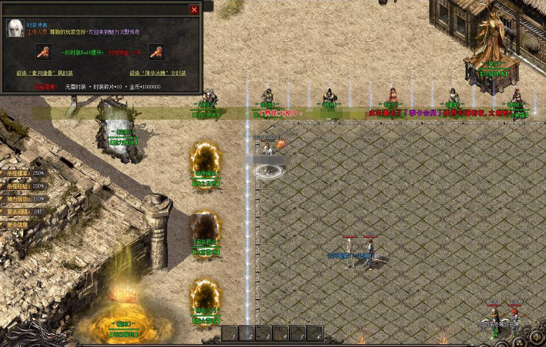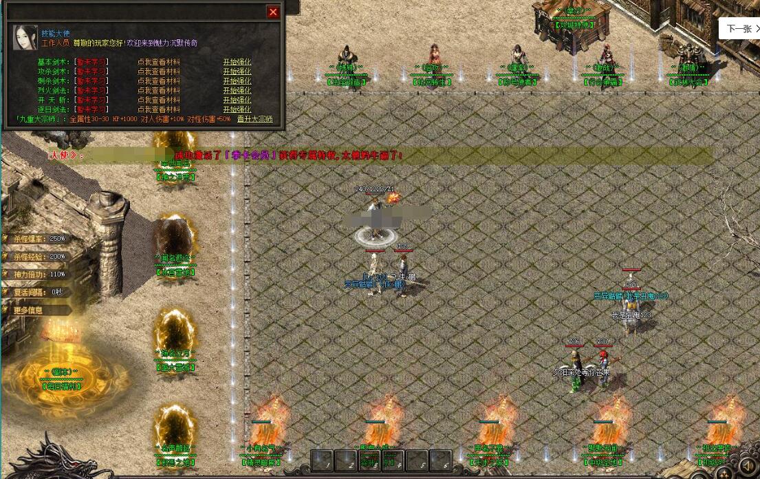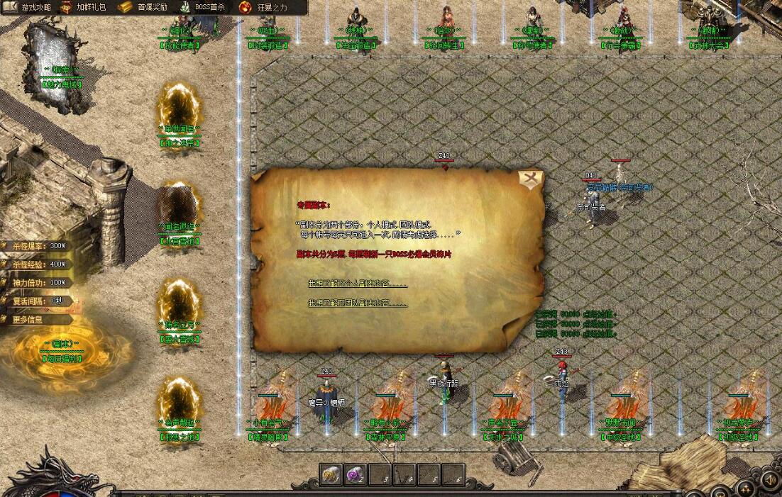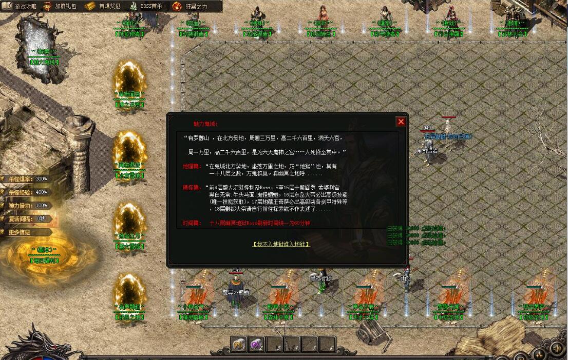 玩家可在休息时间挂在练级地图里进行打怪打装备升级. 本服BOSS耐磨 但我们保证三职业都可以打死BOSS.