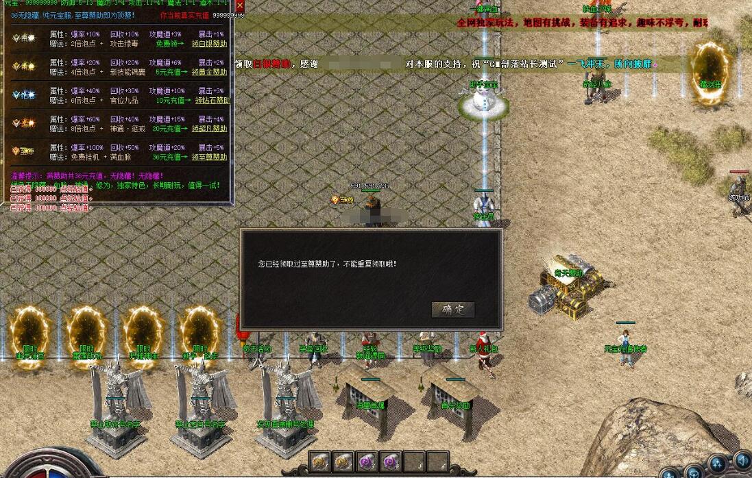 1: 重点:本服所有东西全靠打,赞助也可打,一个赞助闯天下,物价保值轻轻松松一包华子,主打人气