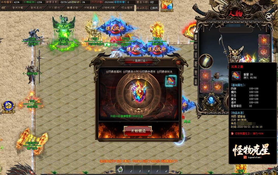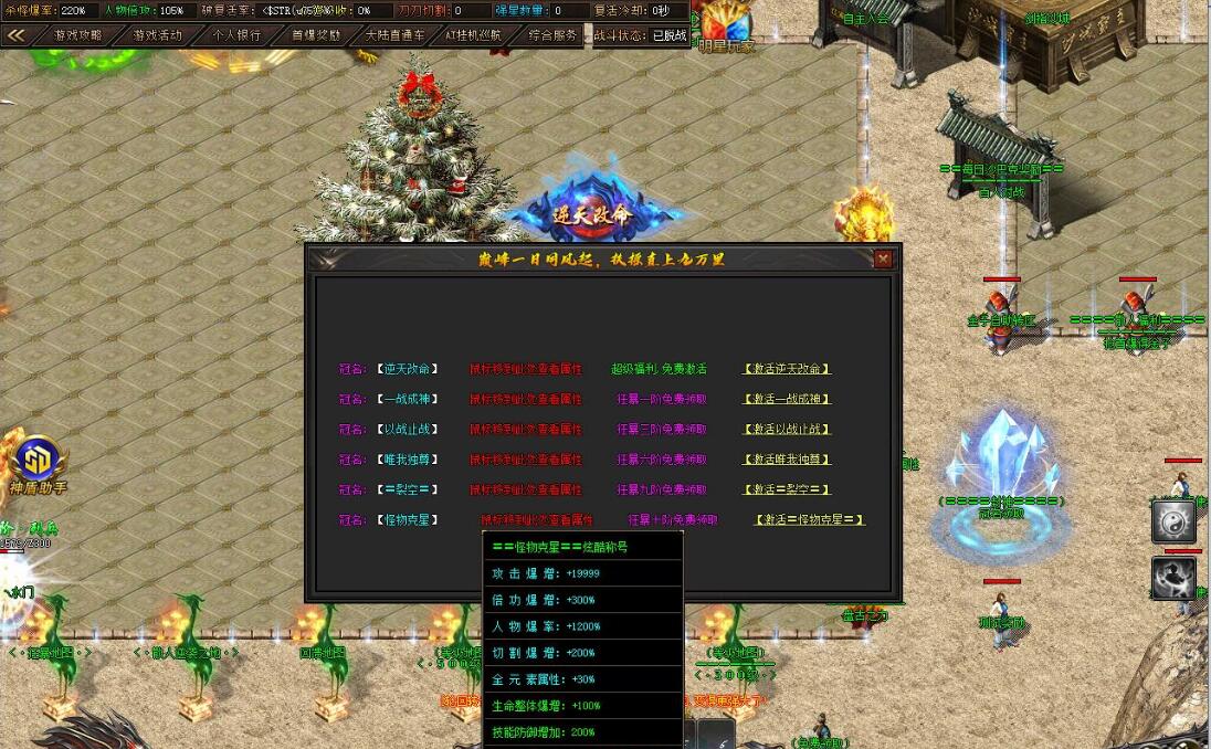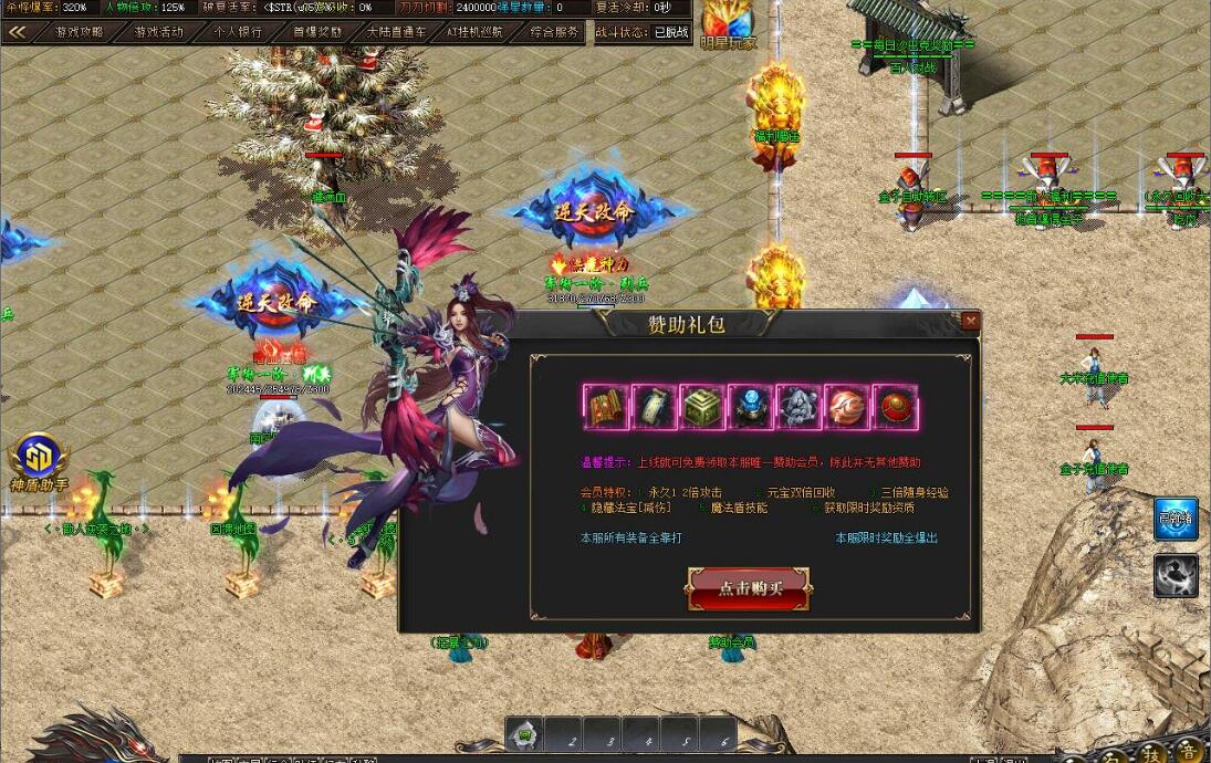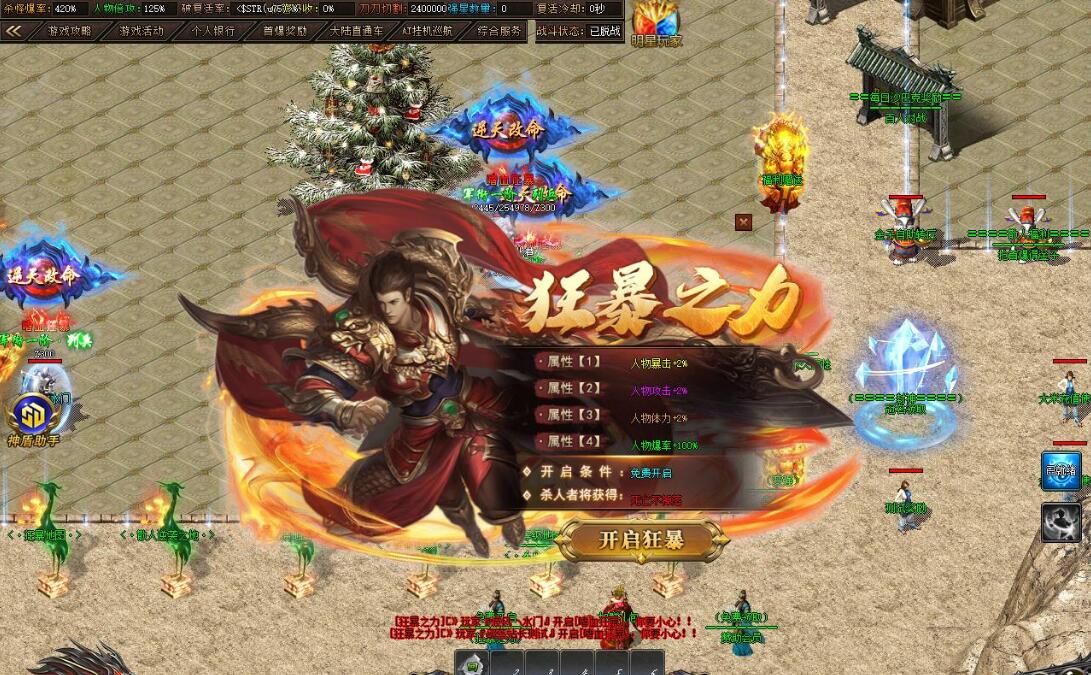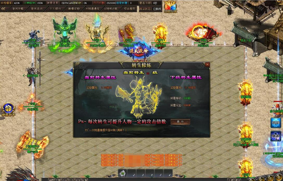 激情一档:充值32大米开启狂暴十级+盘古之力赠送:5倍元宝回收+1000倍爆率+10倍神力+全屏吸怪